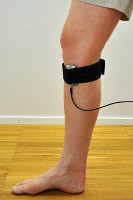 Der Datenlogger wurde bei der Messung mit einem nicht elastischen Fixationsband mit Klettverschluss ventro-medial auf der Tibia fixiert. Dann wurden die Messungen der für die Studien geplanten Intensitäten „stark“, „mässig“, „mittel“ und „leicht“ bei der gleichen Person durchgeführt (Abb. 2). Zwischen den Messungen wurde jeweils eine Pause eingehalten, um übermässiger Ermüdung vorzubeugen.