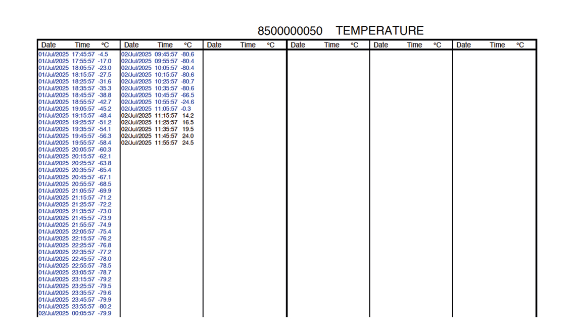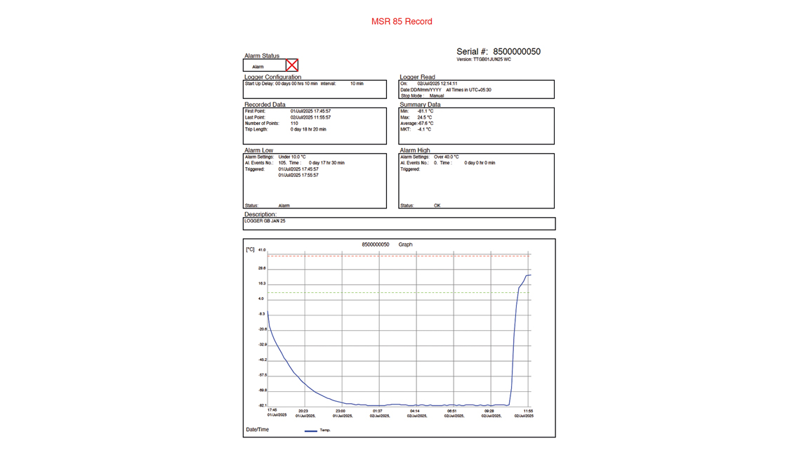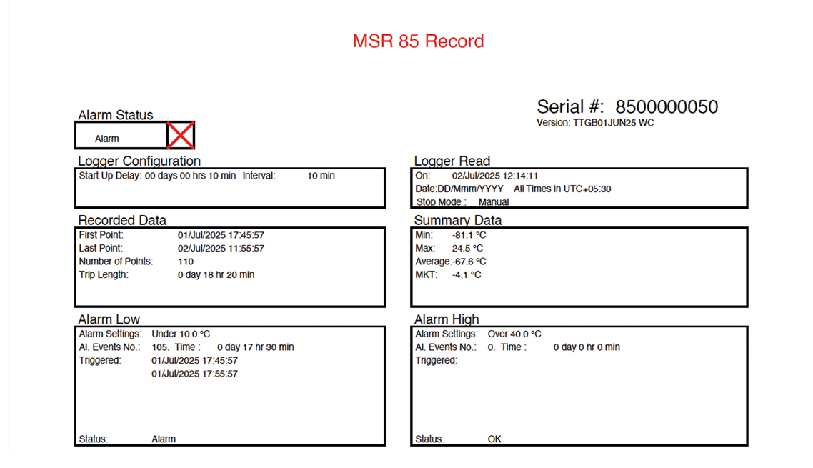 Wird die Aufzeichnung per Tastendruck gestoppt und der Logger via USB verbunden, erstellt der MSR85 automatisch einen manipulationssicheren PDF- und CSV-Bericht mit allen relevanten Daten. Jeder Logger verfügt über ein rückführbares Kalibrierzertifikat in seinem internen Speicher.