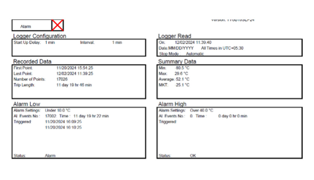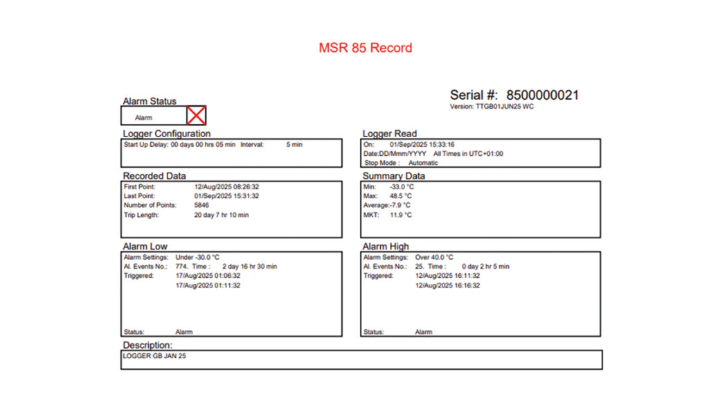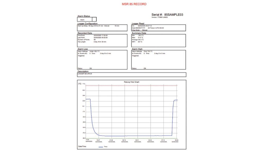After transport, recipients can immediately see via the LED whether threshold values have been exceeded. Once recording is stopped by pressing the button, and the logger is connected to a PC via USB, the MSR85 automatically generates tamper-proof PDF and CSV reports with all relevant data.