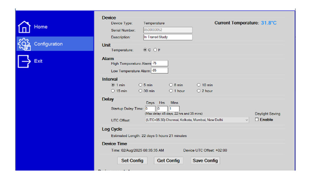 Logging interval: Selectable options: 1 min, 5 min, 8 min, 10 min, 15 min, 30 min, 1 h, 2 h.